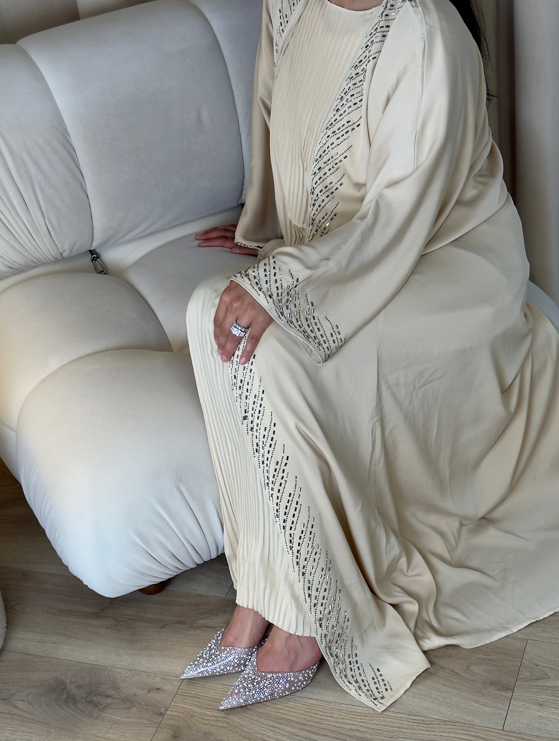 The Fajr Abaya - a luxurious 4-piece set crafted from smooth satin, adorned with delicate embellishments